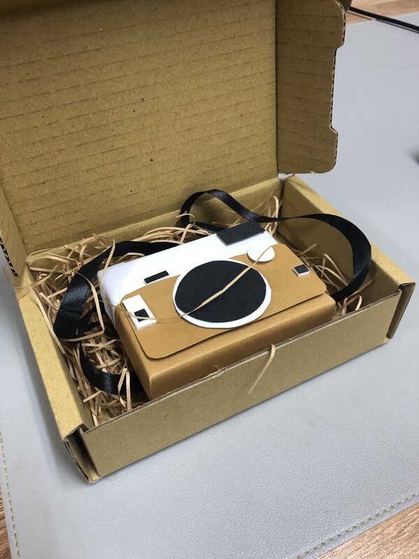 相機上的那些鏡頭、造型全部都是用彩色紙一片片剪貼的,這手工程度也太用心。相機後面還有背帶,可以套在脖子上。