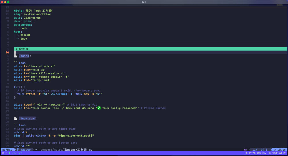 💡 Terminal 只是拿來設定字體、顏色等外觀,真正執行程式的都是在裡面的 tmux。