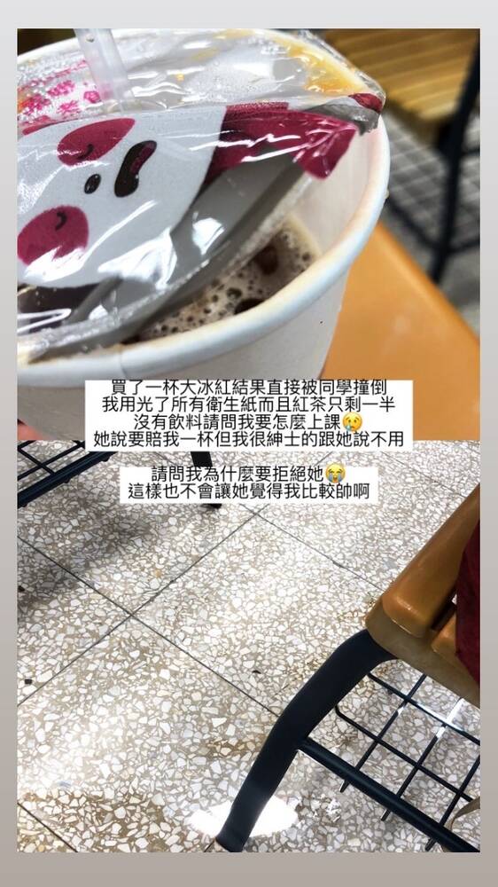 買了一杯大冰紅結果直接被同學撞倒。我用光了所有衛生紙而且紅茶只剩一半,沒有飲料請問我要怎麼上課?