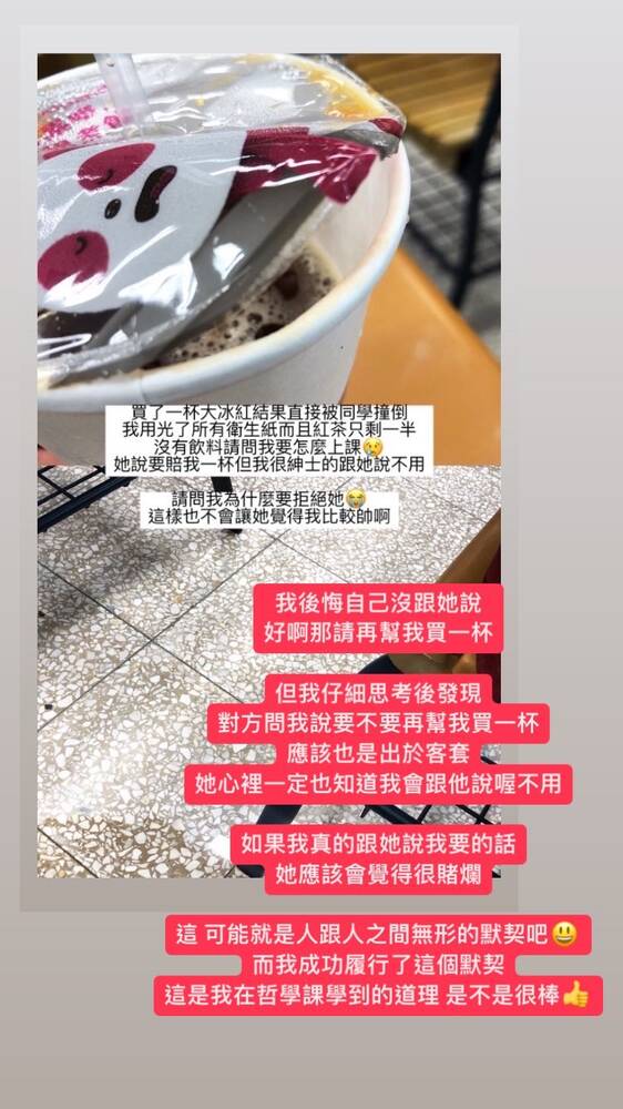 這,可能就是人跟人之間無形的默契吧,而我成功履行了這個默契。這是我在哲學課學到的道理,是不是很棒。