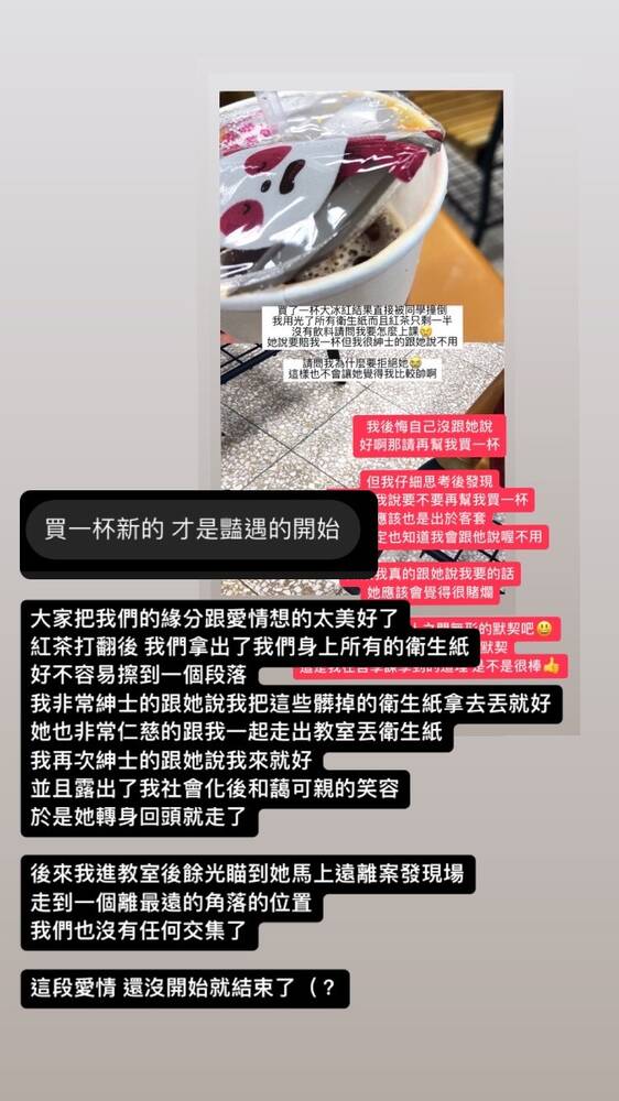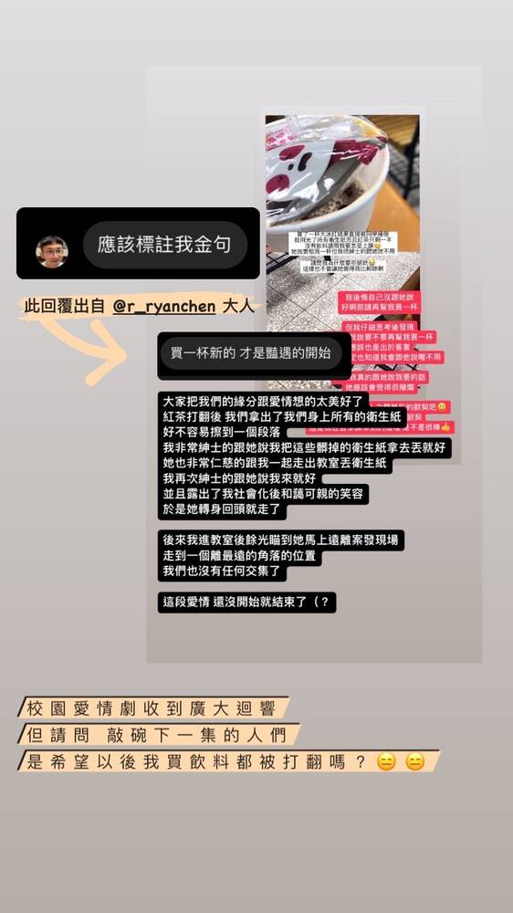 校園愛情劇收到廣大迴響,但請問,敲碗下一集的人們,是希望以後我買飲料都被打翻嗎?😑😑