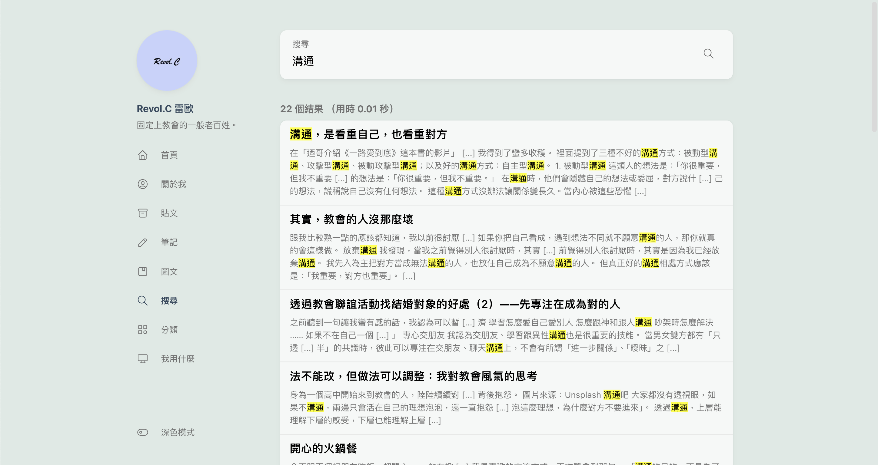 但在這邊,我只要進入搜尋頁面,打像是溝通、戀愛、活著的意義、營隊等等的關鍵字,不到一秒鐘就能跑出所有提到的貼文了。