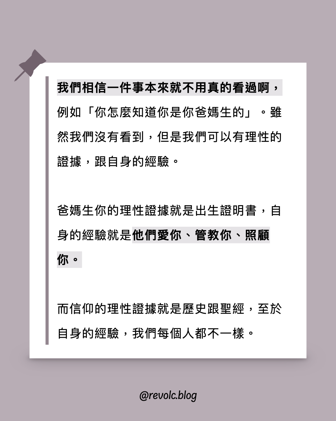 我們相信一件事本來就不用真的看過啊,例如「你怎麼知道你是你爸媽生的」。但是我們可以有理性的證據,跟自身的經驗。