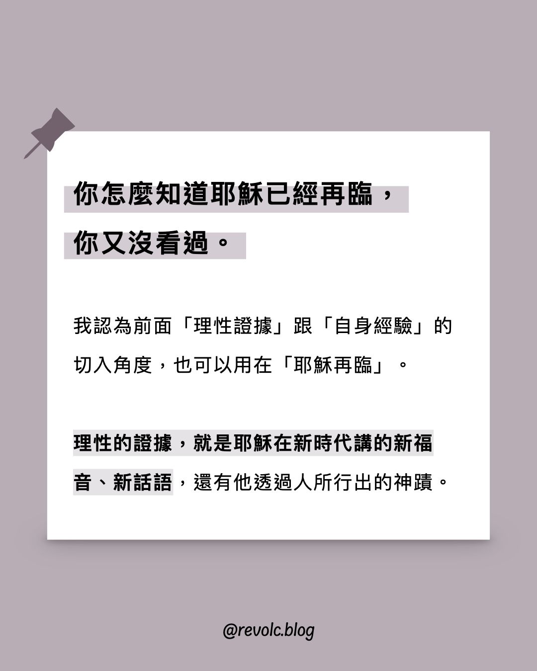 我認為前面「理性證據」跟「自身經驗」的切入角度,也可以用在「耶穌再臨」。