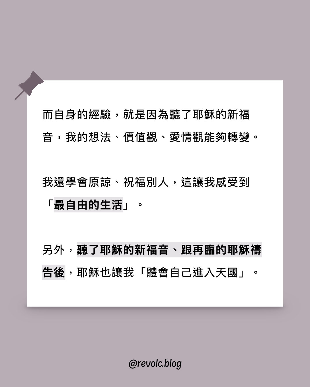 而自身的經驗,就是因為聽了耶穌的新福音,我的想法、價值觀、「愛情觀」能夠轉變。我還學會原諒、「祝福別人」,這讓我感受到「最自由的生活」。