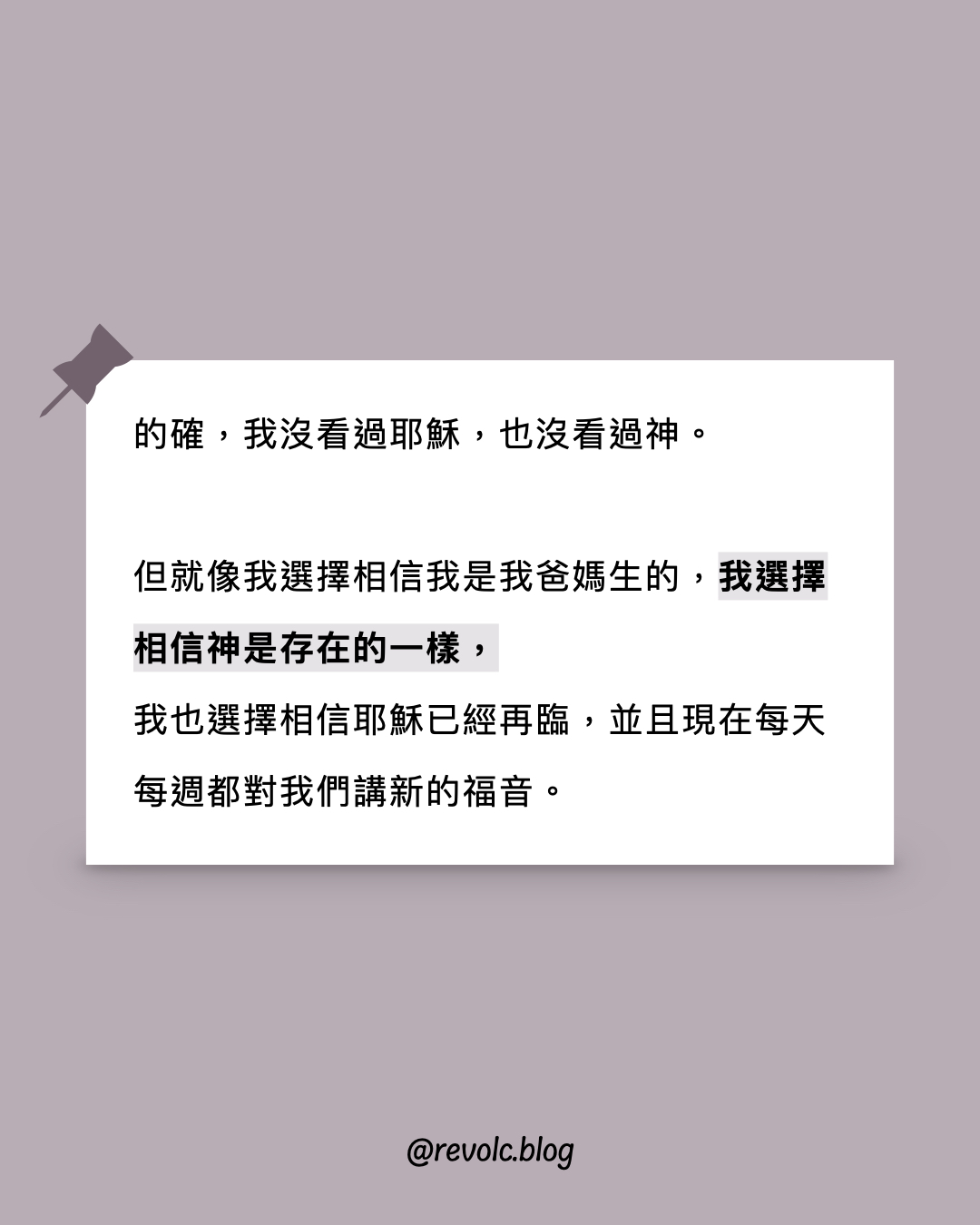 的確,我沒看過耶穌,也沒看過神。但就像我選擇相信我是我爸媽生的,我選擇相信神是存在的一樣,我也選擇相信耶穌已經再臨,並且現在每天每週都對我們講新的福音。