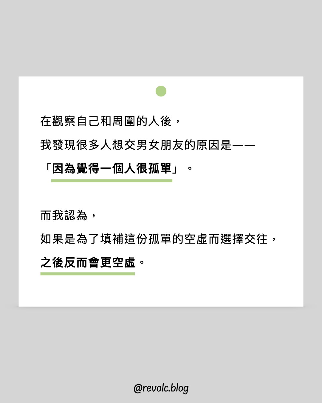 在觀察自己和周圍的人後,我發現很多人想交男女朋友的原因是——「因為覺得一個人很孤單」。