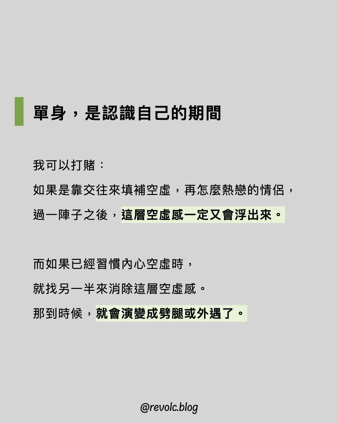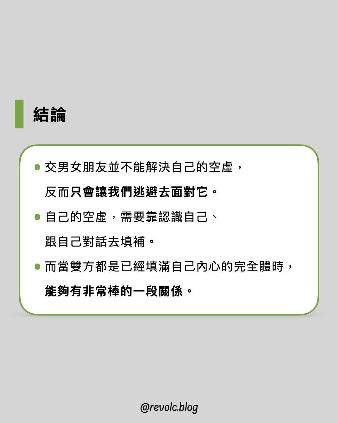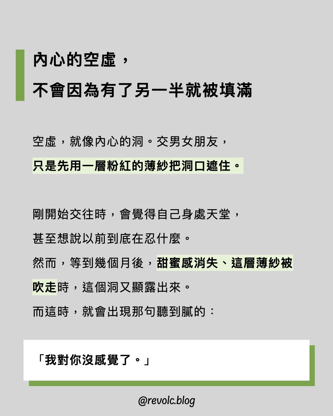 - 交男女朋友並不能解決自己的空虛,反而只會讓我們逃避去面對它。