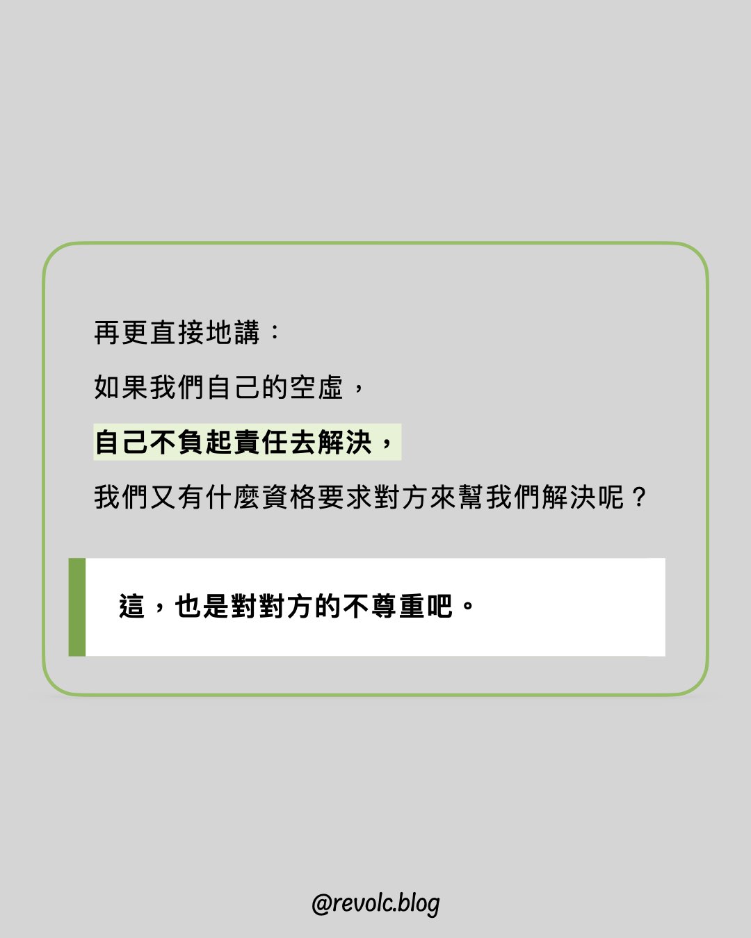 再更直接地講,如果我們自己的空虛,自己不負起責任去解決,我們又有什麼資格要求對方來幫我們解決呢?