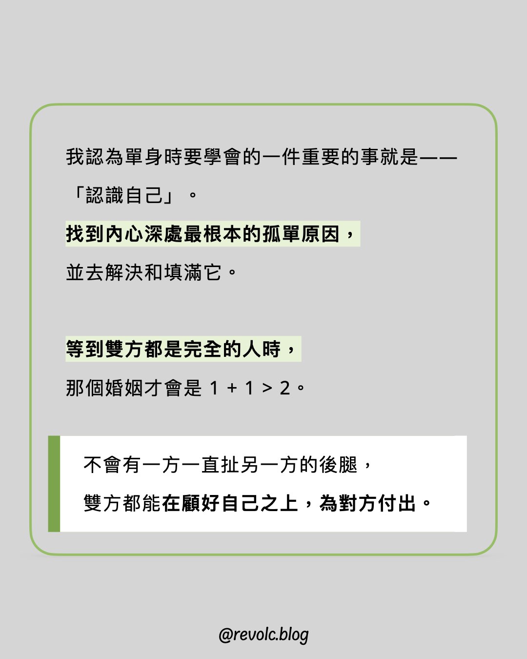 我認為單身時要學會的一件重要的事就是——「認識自己」。找到內心深處最根本的孤單原因,並去解決和填滿它。