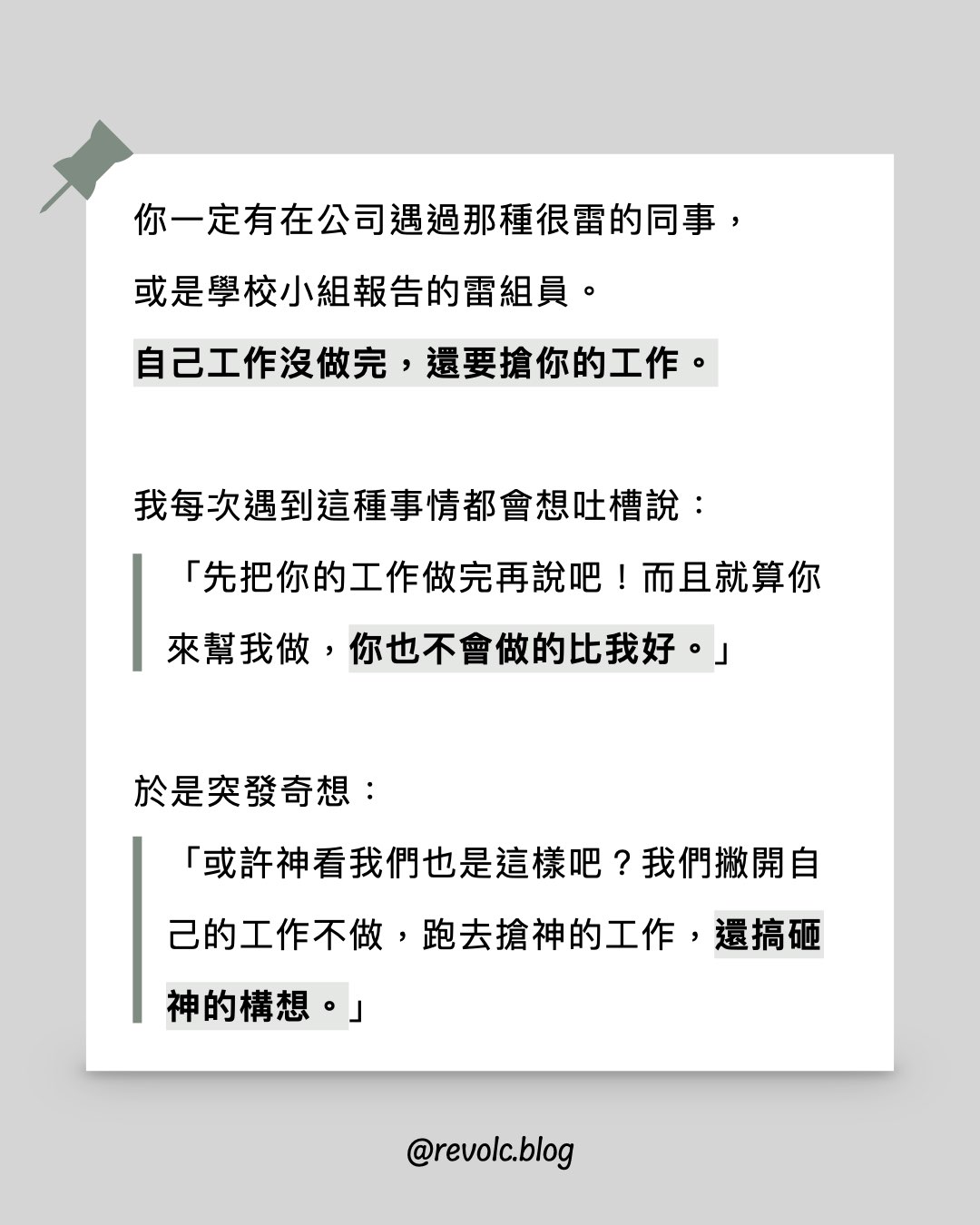 想像一下,如果那個雷組員搶你的工作,最後發現成品不好,還跟你說:「欸為什麼成品那麼爛,你到底有沒有在幫忙?」你大概理智線會斷掉吧。