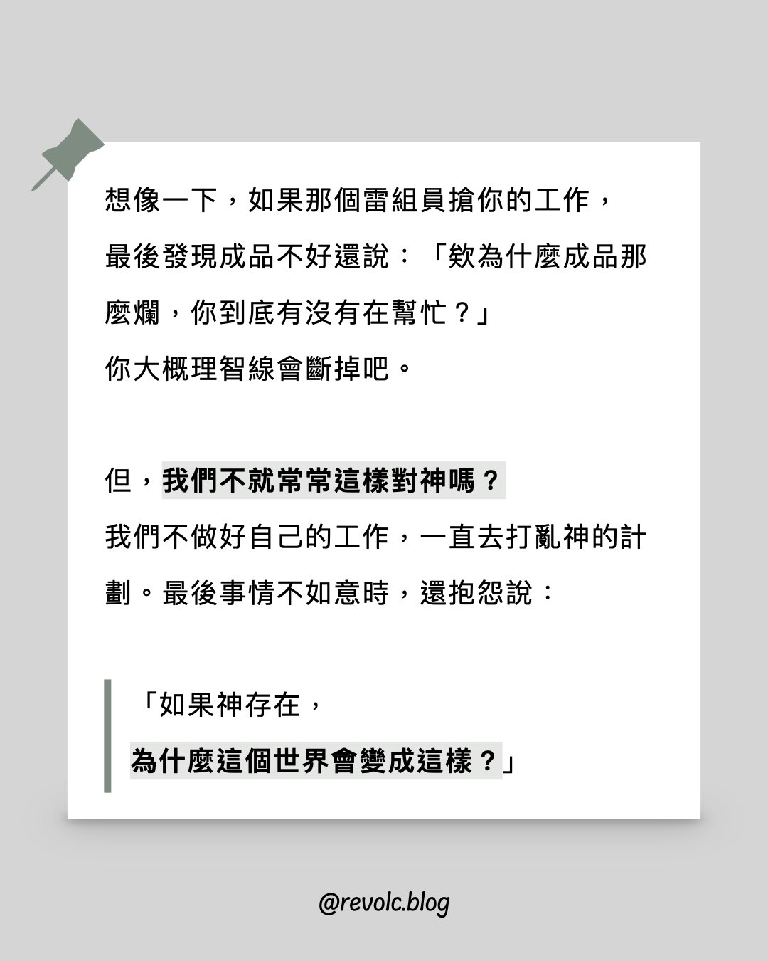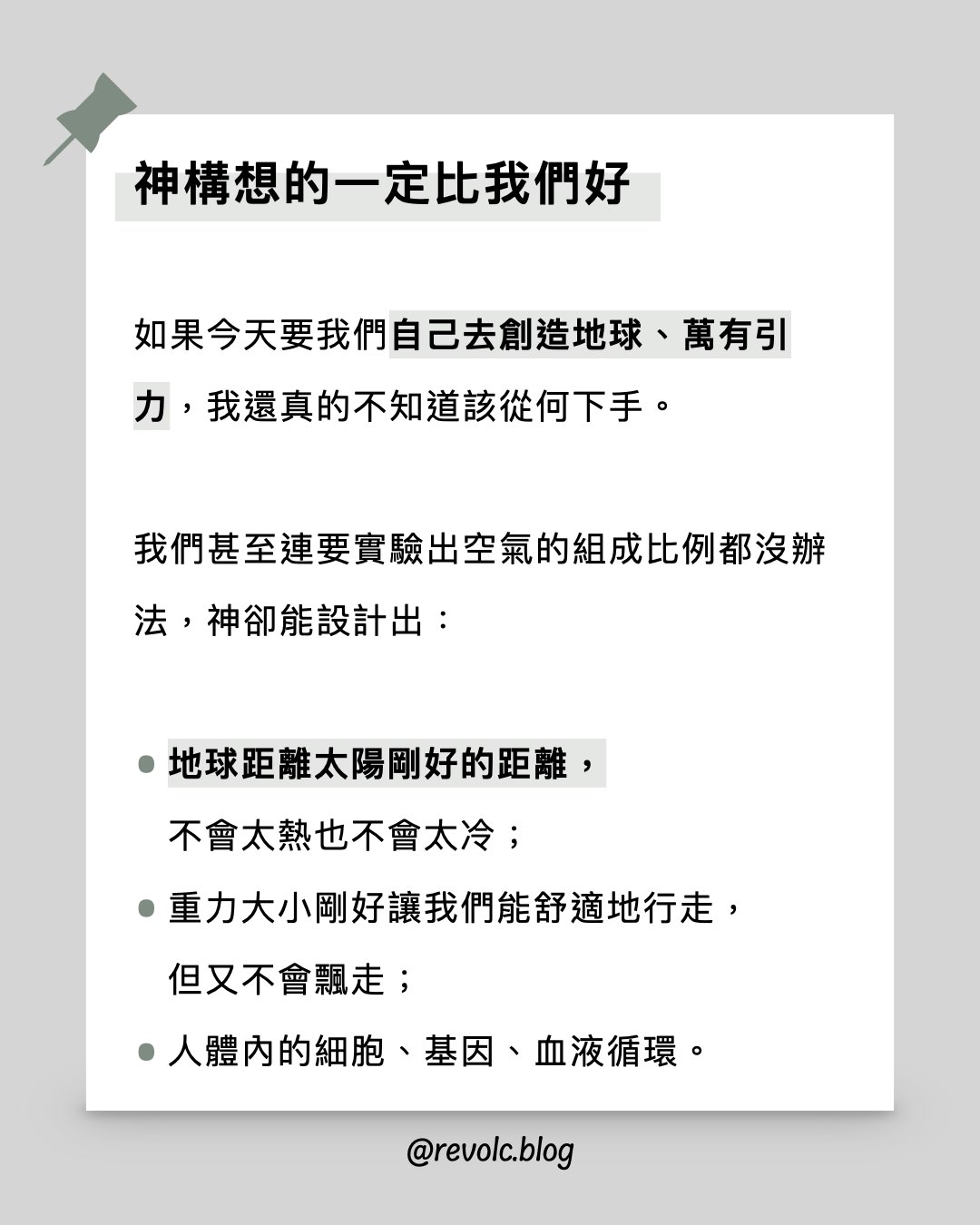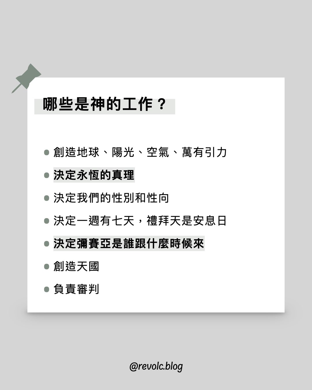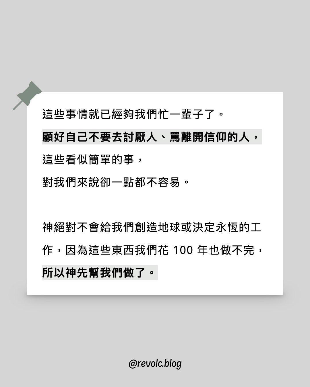 神絕對不會給我們創造地球或決定永恆的工作,因為這些東西我們花 100 年也做不完,所以神先幫我們做了。