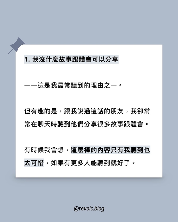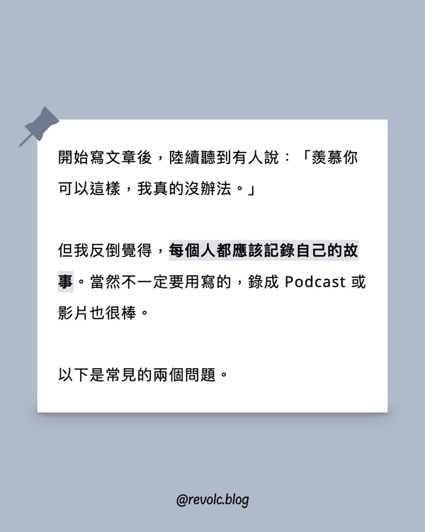 但我反倒覺得,每個人都應該記錄自己的故事。當然不一定要用寫的,錄成 Podcast 或影片也很棒。