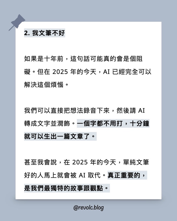 甚至我會說,在 2025 年的今天,單純文筆好的人馬上就會被 AI 取代。真正重要的,是我們最獨特的故事跟觀點。