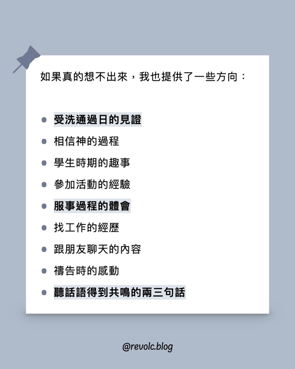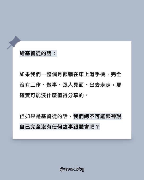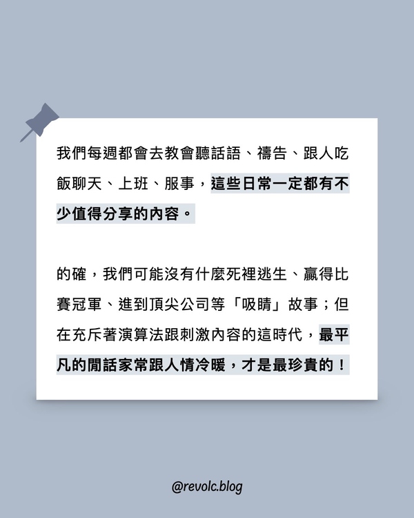 我們每週都會去教會聽話語、禱告、跟人吃飯聊天、上班、服事,這些日常一定都有不少值得分享的內容。
