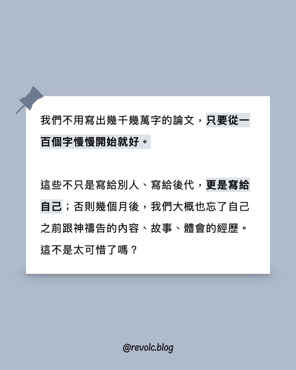 這些不只是寫給別人、寫給後代,更是寫給自己;否則幾個月後,我們大概也忘了自己之前跟神禱告的內容、故事、體會的經歷。這不是太可惜了嗎?