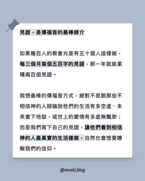 如果幾百人的教會光是有五十個人這樣做,每三個月寫個五百字的見證,那一年就能累積兩百個見證。