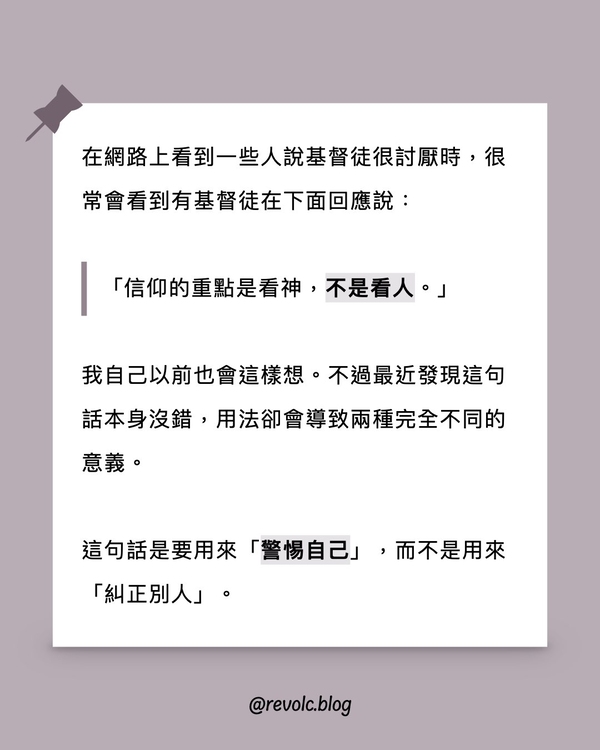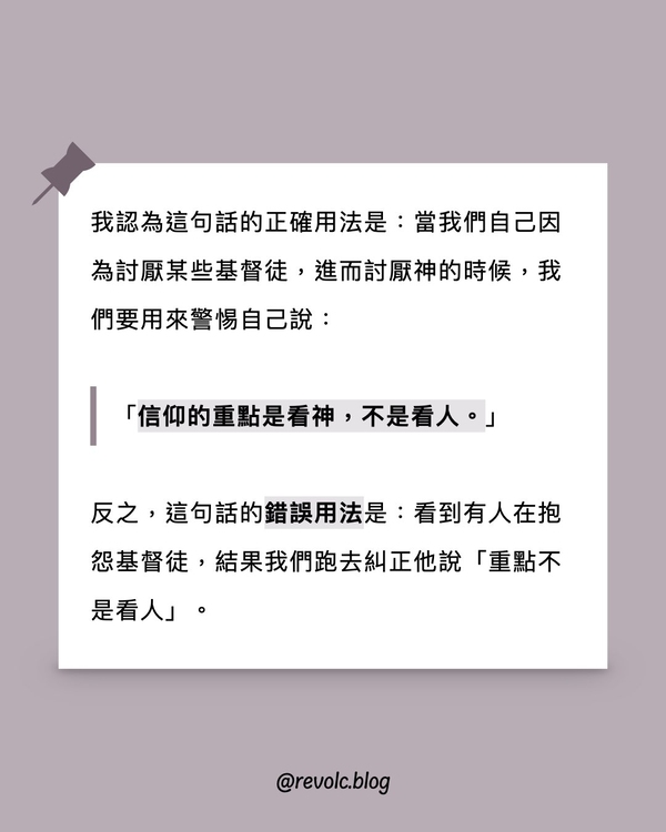 反之,這句話的錯誤用法是:看到有人在抱怨基督徒,結果我們跑去糾正他說「重點不是看人」。