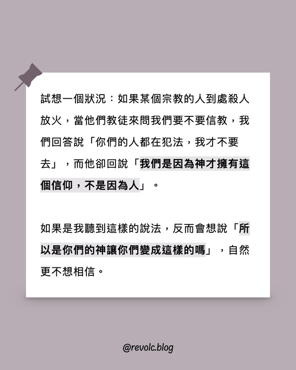 試想一個狀況:如果某個宗教的人到處殺人放火,當他們教徒來問我們要不要信教,我們回答說「你們的人都在犯法,我才不要去」,而他卻回說「我們是因為神才擁有這個信仰,不是因為人」。
