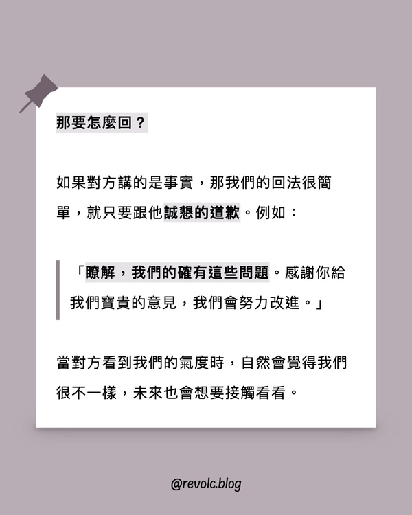 如果對方講的是事實,那我們的回法很簡單,就只要跟他誠懇的道歉。例如:
