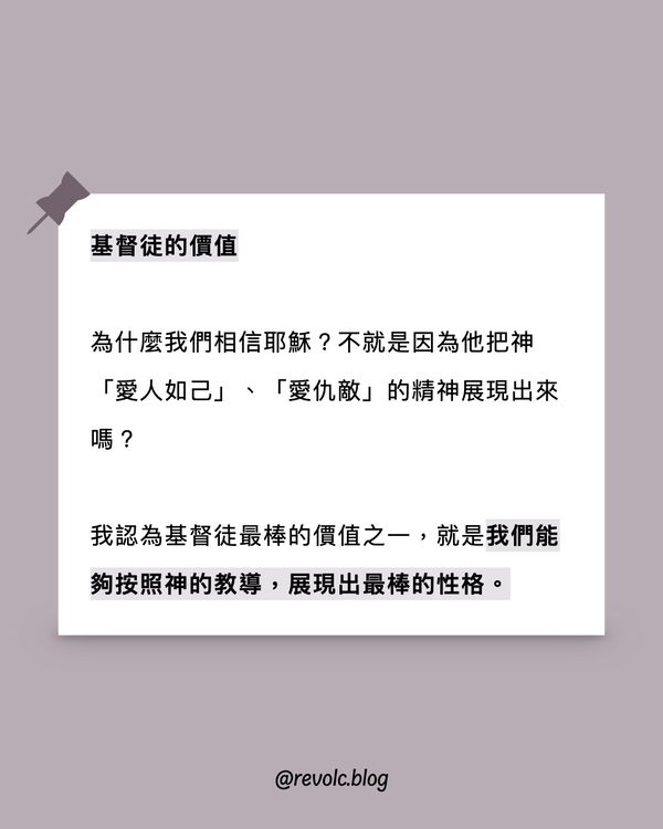 我認為基督徒最棒的價值之一,就是我們能夠按照神的教導,展現出最棒的性格。如果別人看到我們的樣子,就彷彿看到神的愛,並且想嘗試接觸信仰,這對我們基督徒來說是非常大的驕傲。