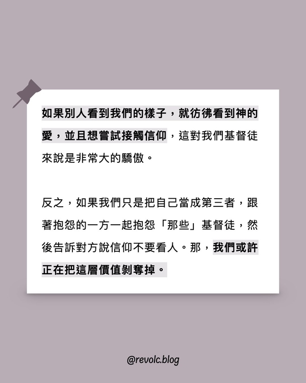 反之,如果我們只是把自己當成第三者,跟著抱怨的一方一起抱怨「那些」基督徒,然後告訴對方說信仰不要看人。那,我們或許正在把這層價值剝奪掉。
