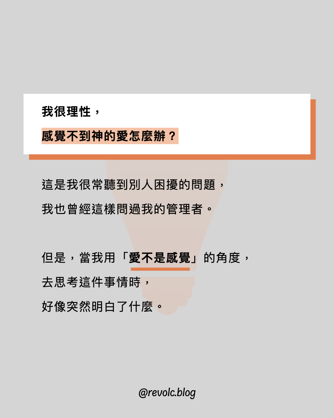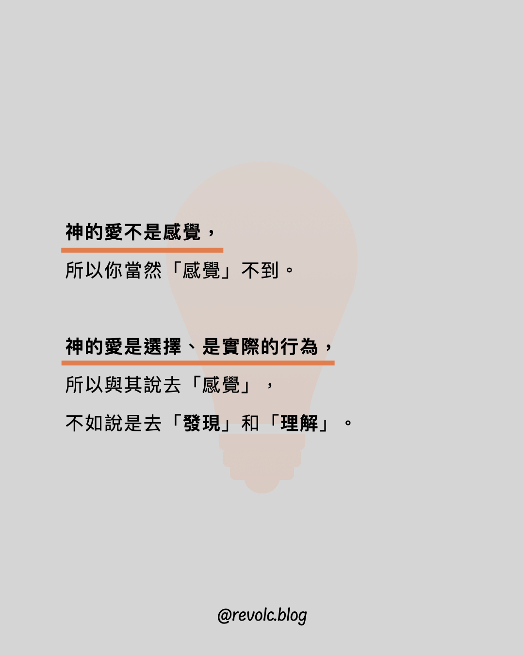 神的愛是選擇、是實際的行為,所以與其說去「感覺」,不如說是去「發現」和「理解」。