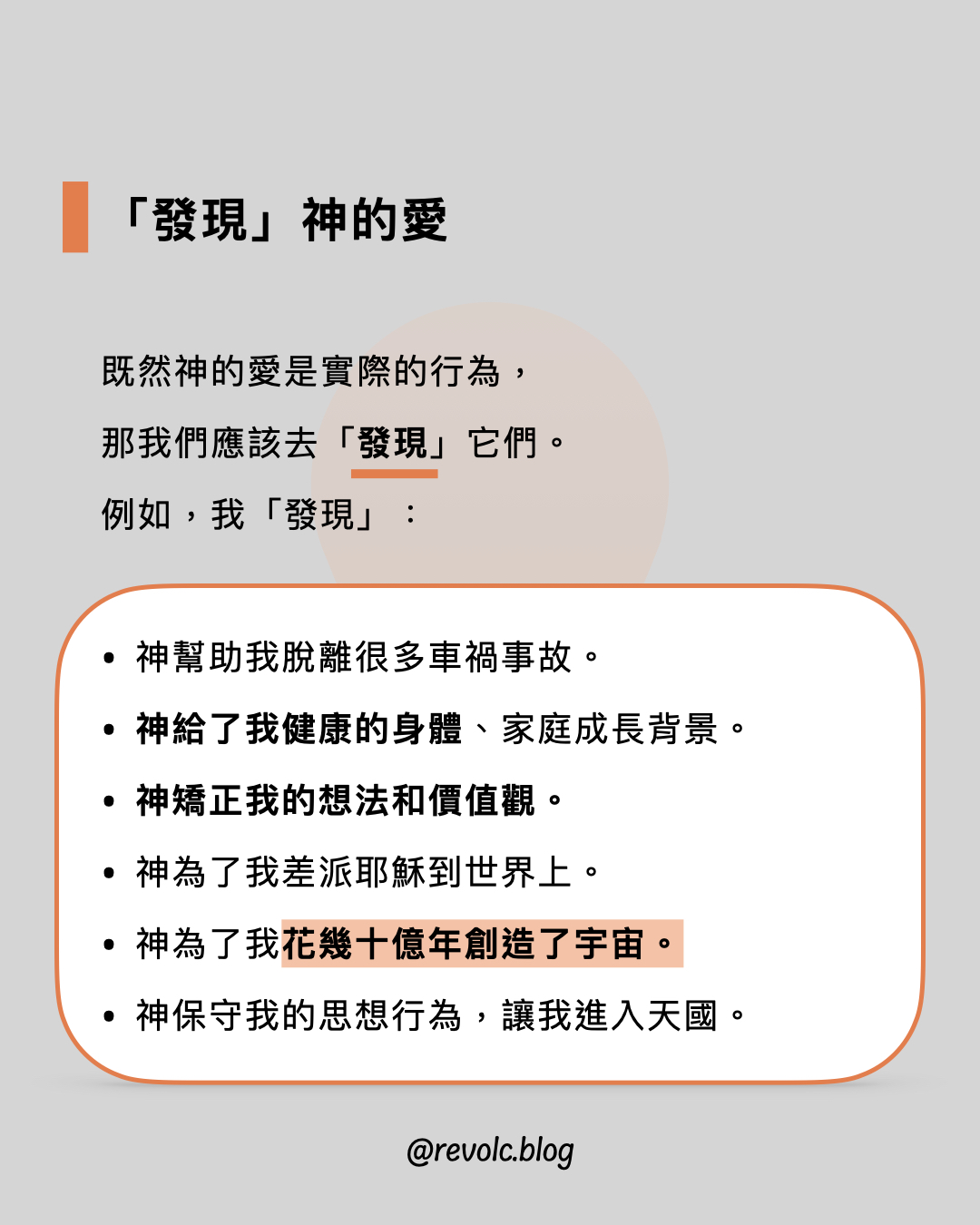既然神的愛有實際的行為,那我們應該去「發現」它們。例如: