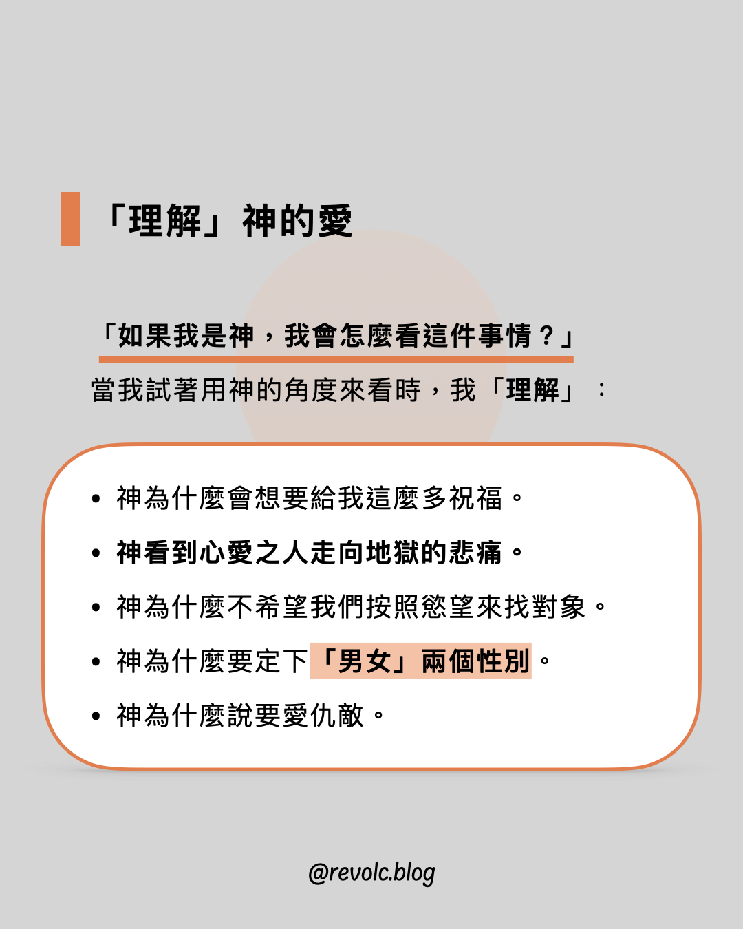 發現之後,我們也可以試著去「理解」神的愛。我自己很常用的方式是「角色調換」,像是: