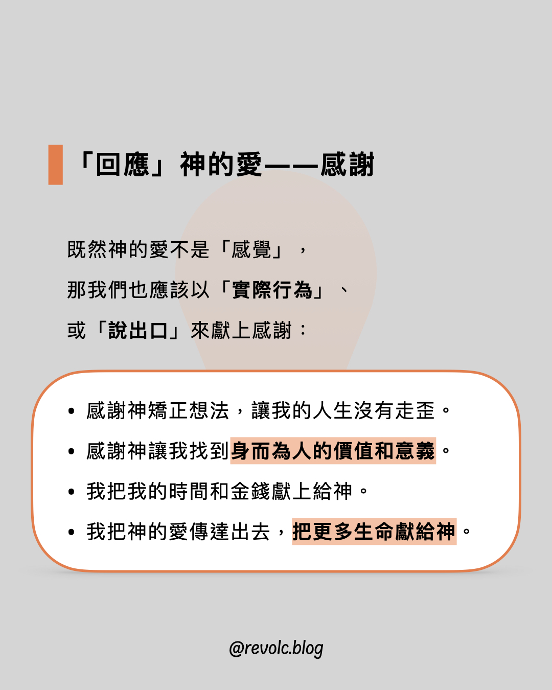 既然神的愛不是「感覺」,那我們也不應該是用「感覺」來回應神的愛,而是要以「實際行為」來獻上感謝。