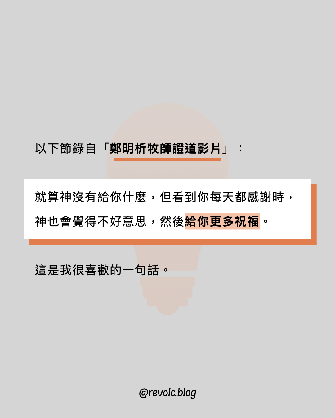 「就算神沒有給你什麼,但看到你每天都感謝時,神也會覺得不好意思,然後給你更多祝福。」