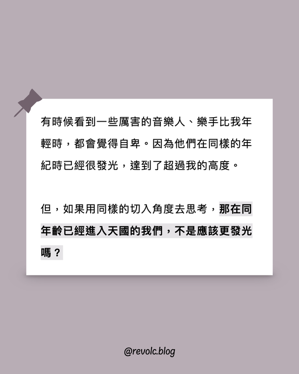但,如果用同樣的切入角度去思考,那在同年齡已經進入天國的我們,不是應該更發光嗎?