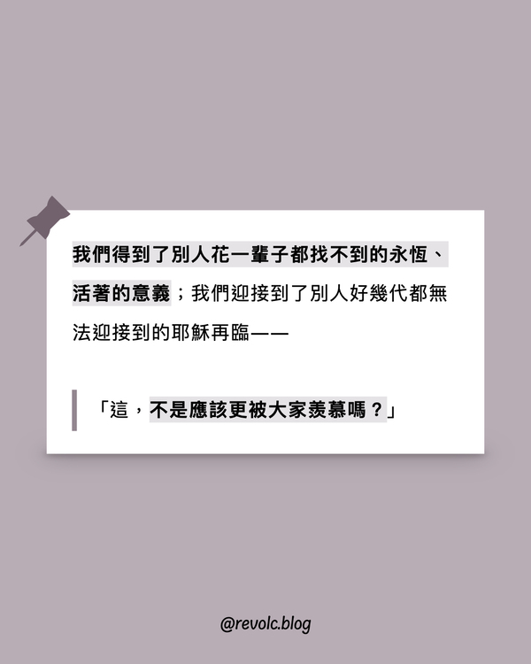 我們得到了別人花一輩子都找不到的永恆、活著的意義;我們迎接到了別人好幾代都無法迎接到的耶穌再臨——