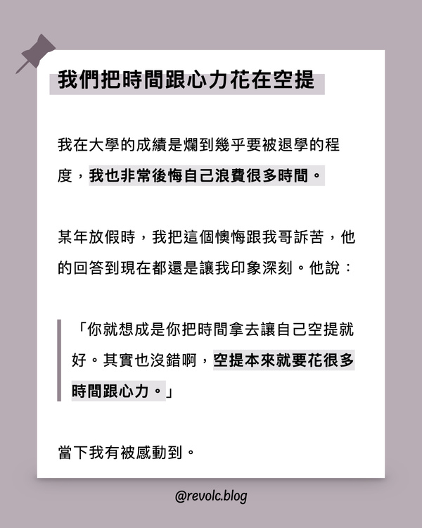 某年放假時,我把這個懊悔跟我哥訴苦,他的回答到現在都還是讓我印象深刻。他說: