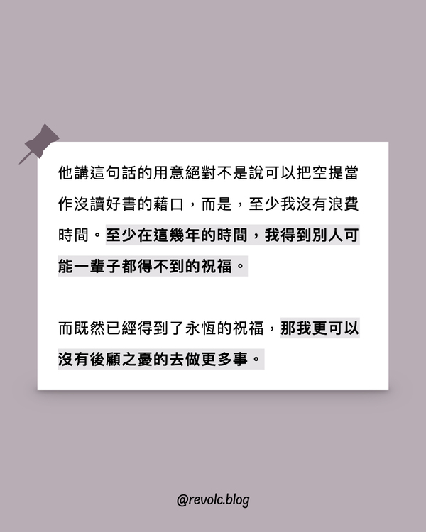 他講這句話的用意絕對不是說可以把空提當作沒讀好書的藉口,而是,至少我沒有浪費時間,至少在這幾年的時間,我得到別人可能一輩子都得不到的祝福。