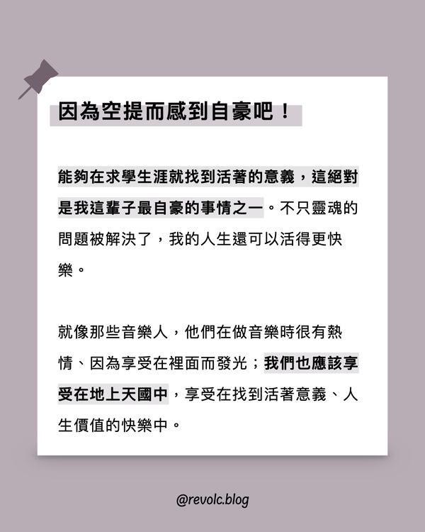 就像那些音樂人,他們在做音樂時很有熱情、因為享受在裡面而發光;我們也應該享受在地上天國中,享受在找到活著意義、人生價值的快樂中。