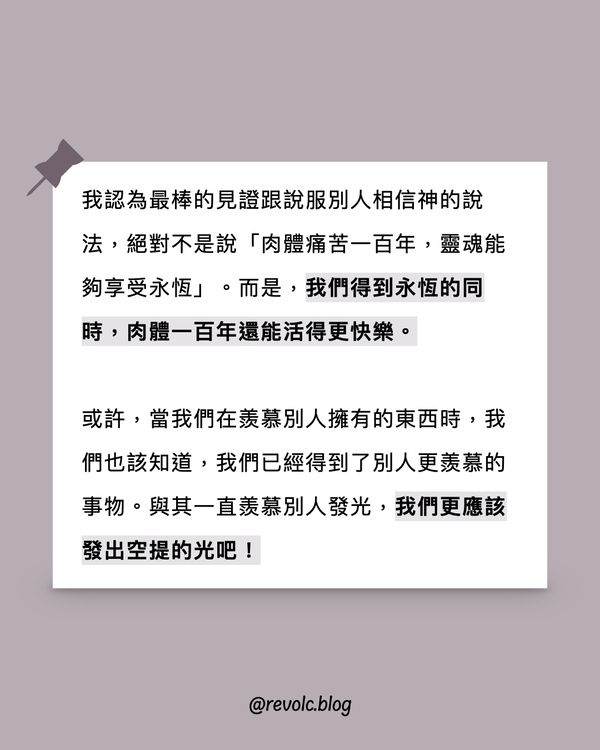 我認為最棒的見證跟說服別人相信神的說法,絕對不是說「肉體痛苦一百年,靈魂能夠享受永恆」。而是,我們得到永恆的同時,肉體一百年還能活得更快樂。