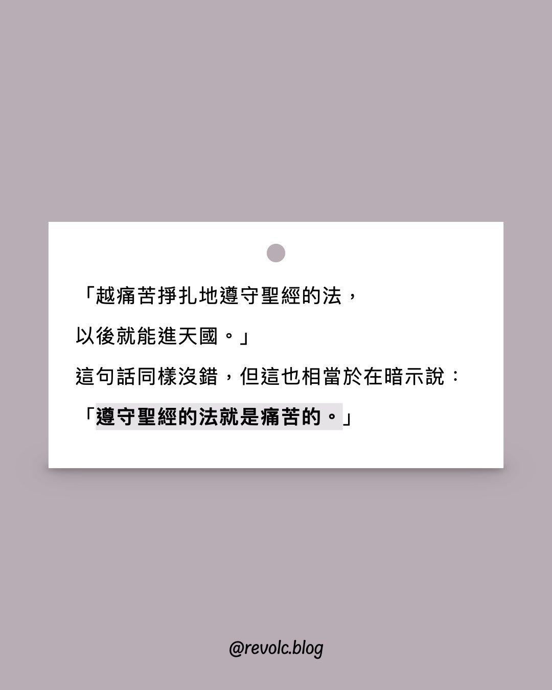 「越痛苦掙扎地遵守聖經的法,以後就能進天國。」
