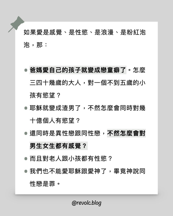 - 我們也不能愛耶穌跟愛神了,畢竟神說同性戀是罪。