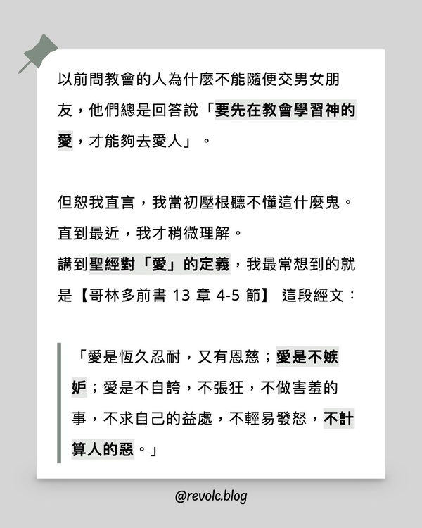 講到聖經對「愛」的定義,我最常想到的就是【哥林多前書 13 章 4-5 節】 這段經文:
