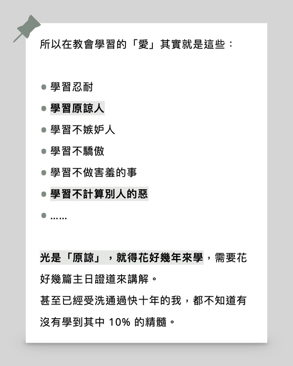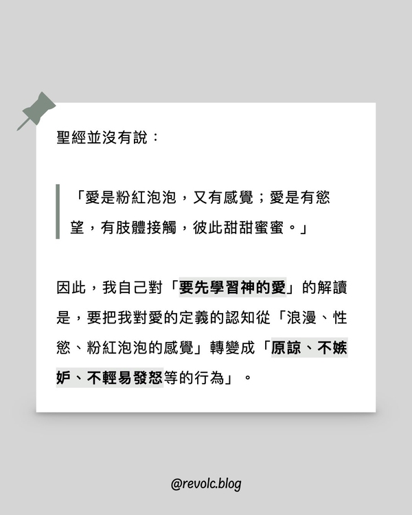 因此,我自己對「要先學習神的愛」的解讀是,要把我對愛的定義的認知從「浪漫、性慾、粉紅泡泡的感覺」轉變成「原諒、不嫉妒、不輕易發怒等的行為」。