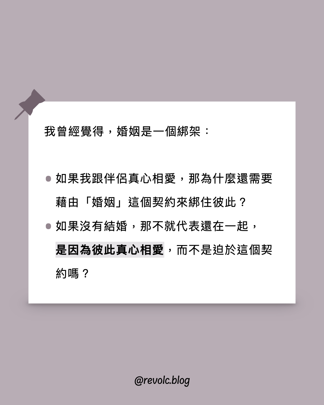 - 如果我跟伴侶真心相愛,那為什麼還需要藉由「婚姻」這個契約來綁住彼此?