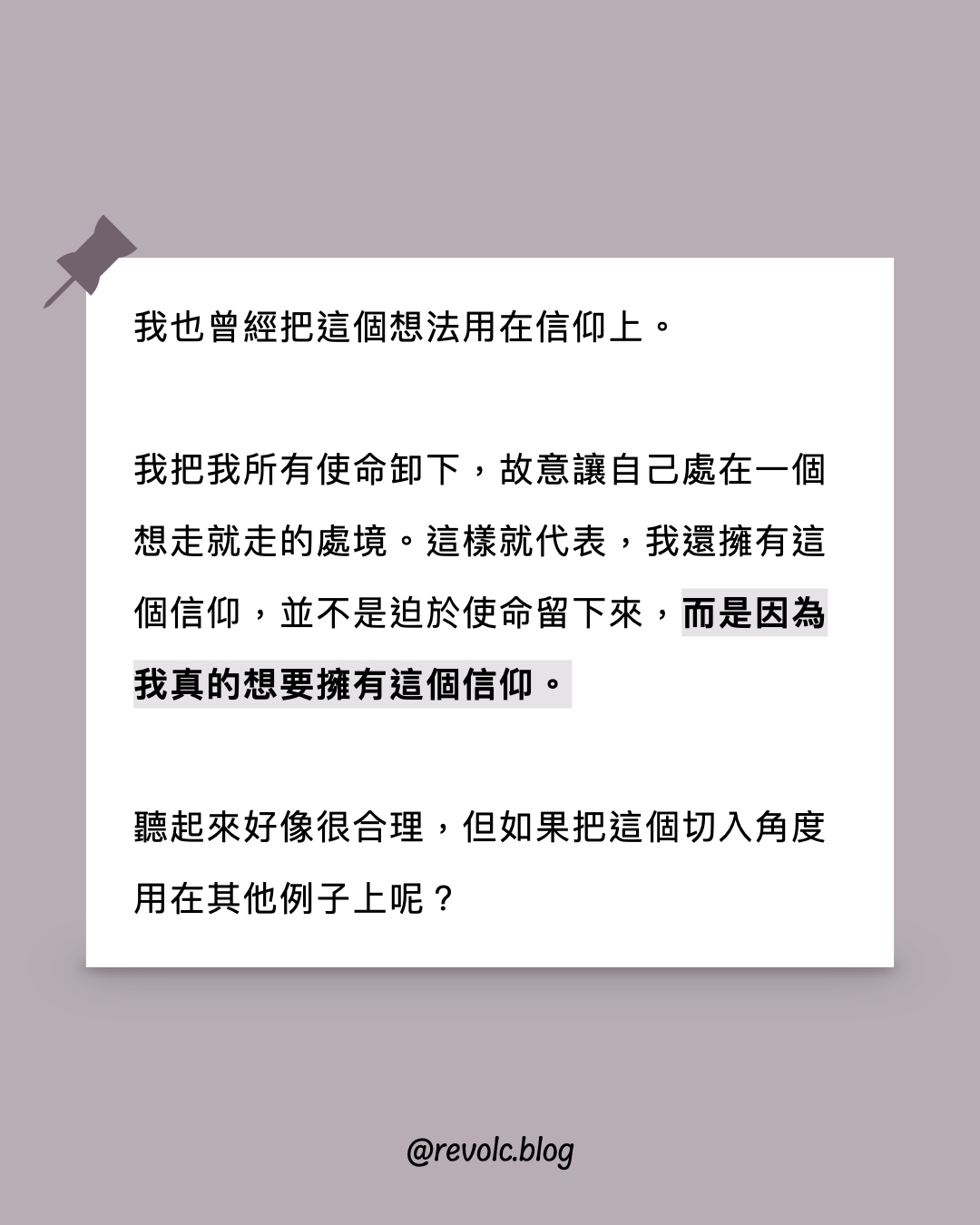 我把我所有使命卸下,故意讓自己處在一個想走就走的處境。這樣就代表,我還擁有這個信仰,並不是迫於使命留下來,而是因為我真的想要擁有這個信仰。