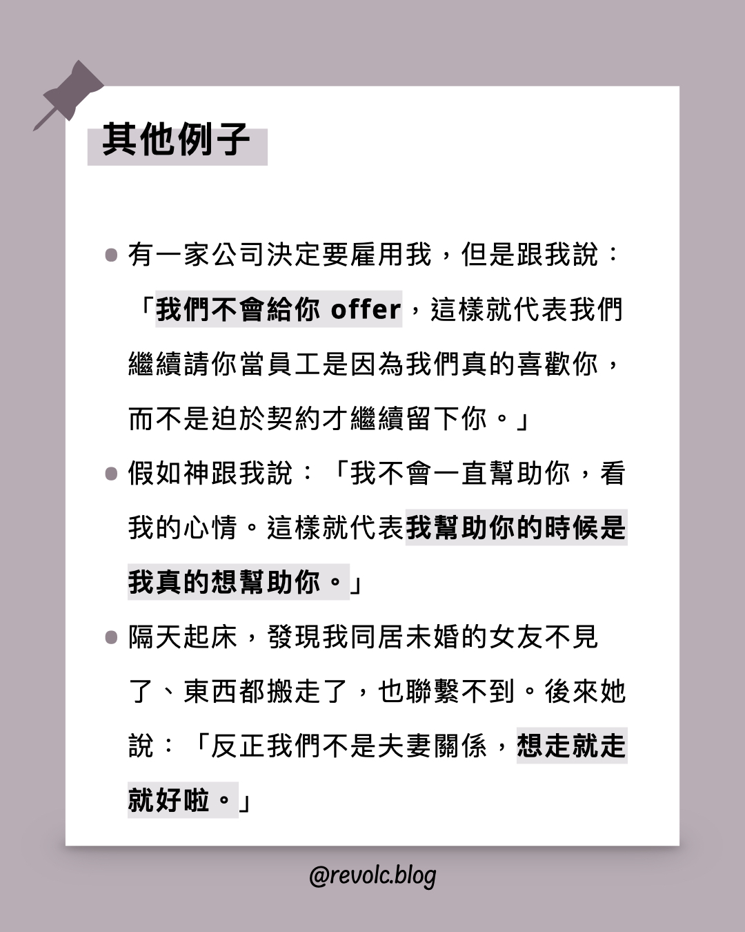 - 有一家公司決定要雇用我,但是跟我說:「我們不會給你 offer,這樣就代表我們繼續請你當員工是因為我們真的喜歡你,而不是迫於契約才繼續留下你。」