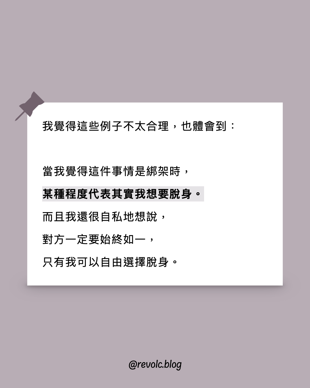我覺得這些例子不太合理,也體會到:當我覺得這件事情是綁架時,某種程度代表其實我想要脫身。而且我還很自私地想說,對方一定要始終如一,只有我可以自由選擇脫身。