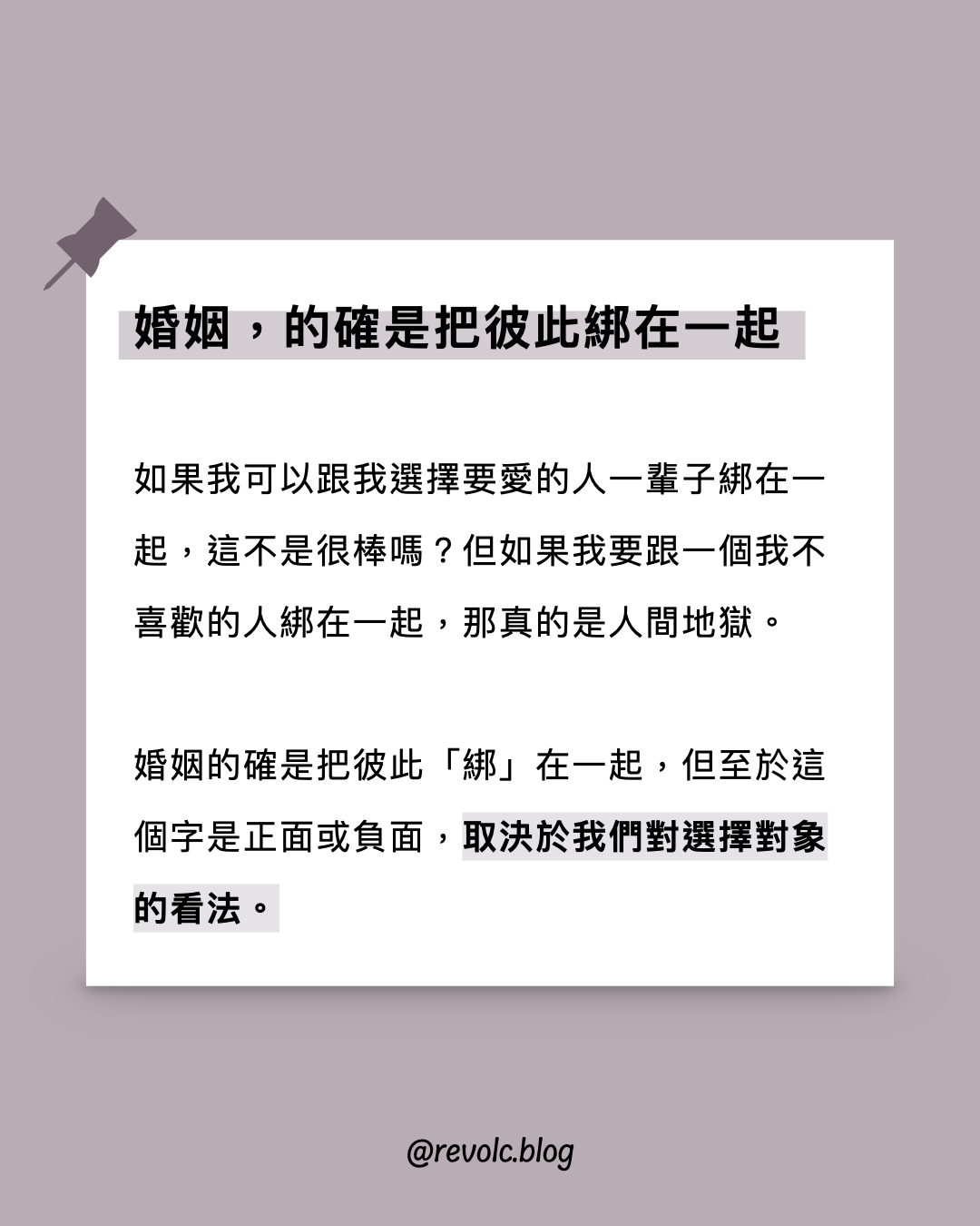 婚姻的確是把彼此「綁」在一起,但至於這個字是正面或負面,取決於我們對選擇對象的看法。