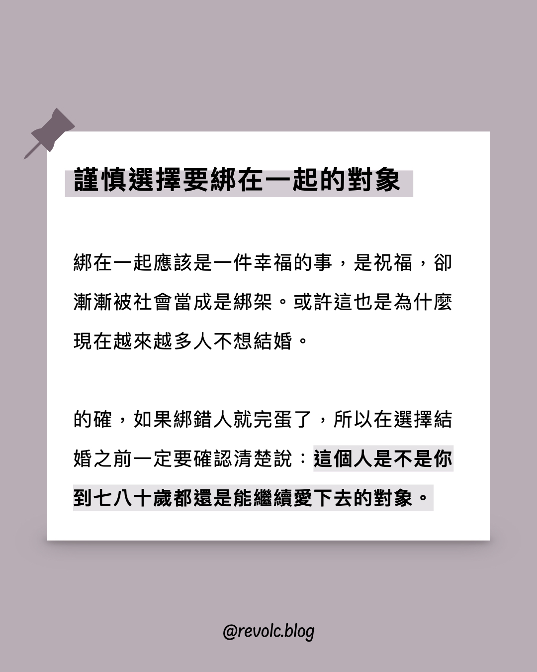 的確,如果綁錯人就完蛋了,所以在選擇結婚之前一定要確認清楚說:這個人是不是你到七八十歲都還是能繼續愛下去的對象。