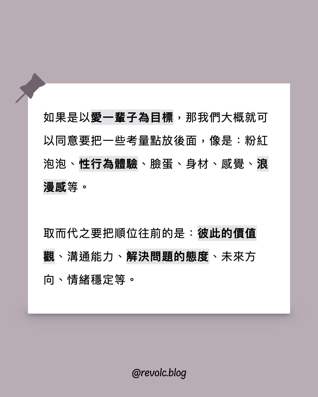 如果是以愛一輩子為目標,那我們大概就可以同意要把一些考量點放後面,像是:粉紅泡泡、性行為體驗、臉蛋、身材、感覺、浪漫感等。