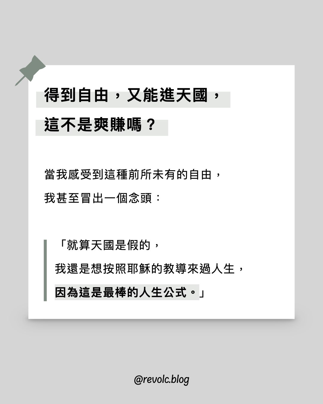 「就算天國是假的,我還是想按照耶穌的教導來過人生,因為這是最棒的人生公式。」