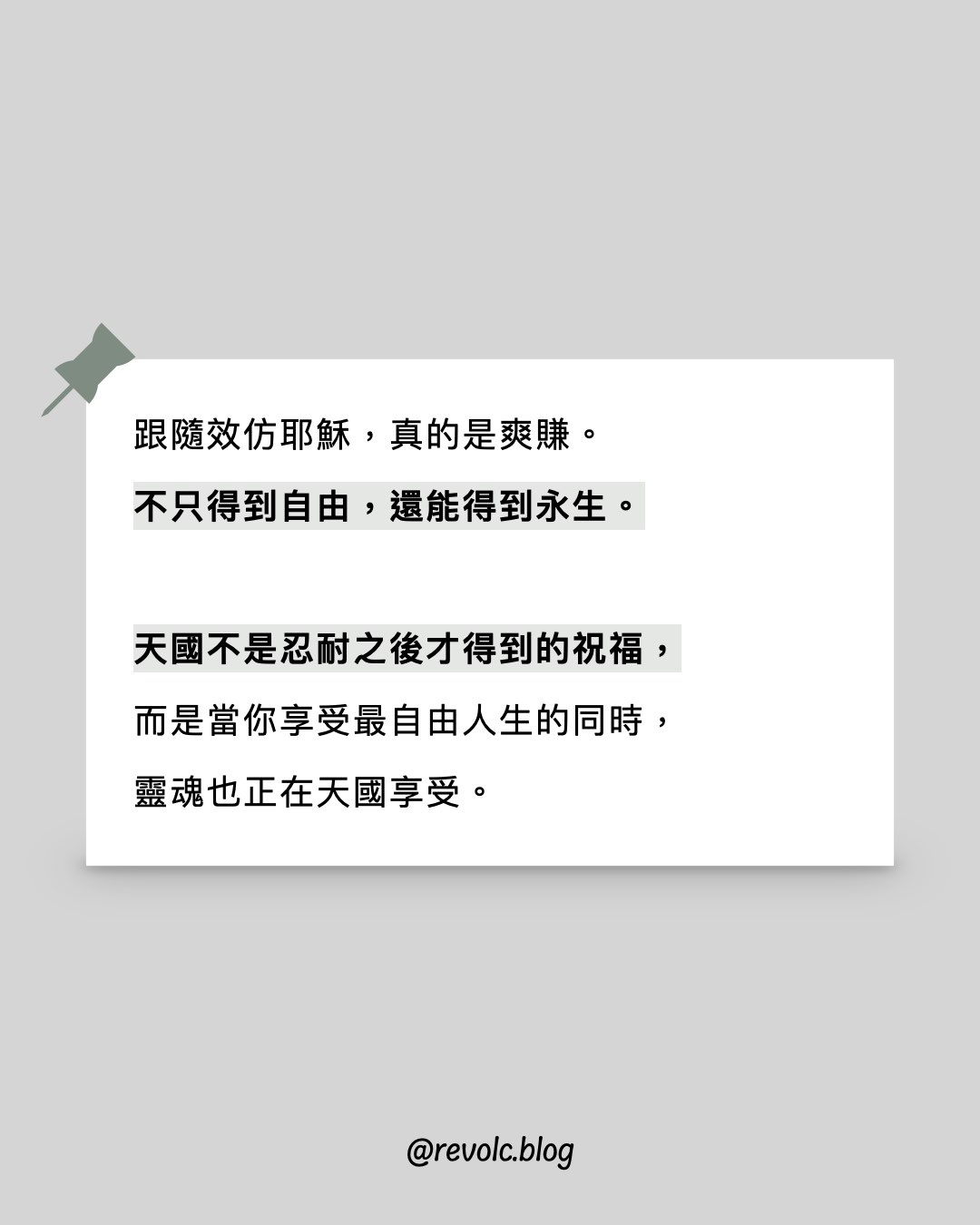 跟隨效仿耶穌,真的是爽賺。不只得到自由,還能得到永生。